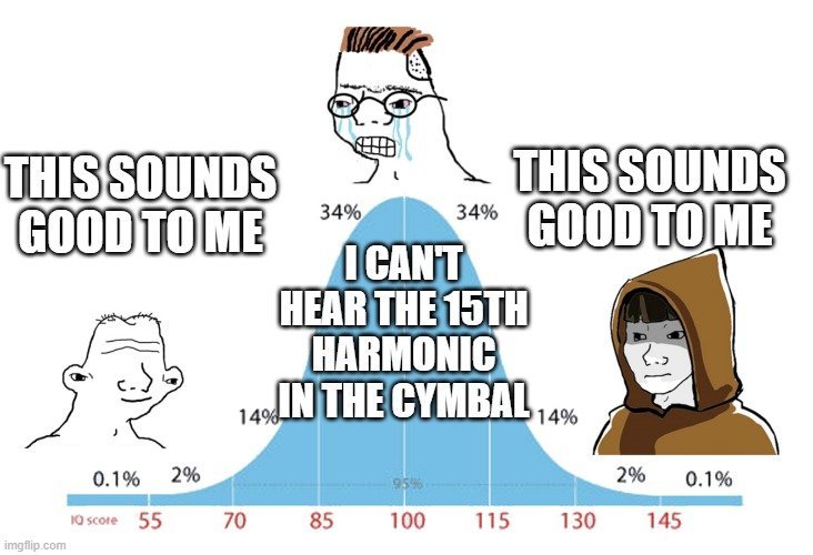 По отношение на качеството на музиката, абсолютно никаква. Вземи записите на Бийтълс – пращят, трещят, нямат бас, високи, обем, но до ден днешен отиди на Бийтълс трибют, всички пеят и скачат – прекрасни песни, 80 г. по-късно всеки ги знае, пее, свири и им се радва. Не всеки музикален стил обаче е така. Ако вземем да речем Periphery, Tessaract, Northlane или която и да е друга модерна прогресивна-метъл банда, където те връхлитва водопад от енергия, китари, барабани, бас, крещящи вокали и т.н. добрият баланс е от ключово значение. Ако имат звук като Бийтълс, всичко ще отиде по дяволите. Според мен границата се поставя като част от цялостната философия зад продукцията и няма златен куршум за цялото нещо, който да работи универсално. Не е гарантирано. Не един и двама хоби музиканти, които печелят доста пари от основната си професия правят качествена продукция от техническа и естетическа гледна точка, но това не стига до масите, а парите, които наливат са сериозни. Не винаги е нужно да целят професионален успех, възможно е да е просто това да е техен начин на медитация, техен олтар, верую или нещо, в което вярват и искат да го представят по възможно най-добрият начин пред света. "Простосмъртните" хора без "златни/аналитични уши" усещат музиката предимно емоционално, за тях техническите параметри са без значение, и така трябва да бъде. Ако едно нещо е направено добре, няма значение колко си ерудиран, интелигентен или образован, то просто ти въздейства. В гимназията учителят ни по музика ни разказваше как през лятната ваканция ходил с Жигулата да натовари едни картофи от село и качил на стоп някакъв негов комшия, от ромски произход, със завършен 8-ми клас. В касетофонът учителят си бил пуснал някой от концертите на Моцарт и землякът послушал, послушал и казал: "Ей, бате, не знам какво е това, но много хубабо, бе." Да, звучи комично, но според мен лично всеки човек с елементарен разсъдък няма как да остане безразличен към творчеството на класиците, щом толкова столетия по-късно ги изучаваме и все още нямат стигане. Колкото до техническите параметри, според мен всеки човек който е запален по музиката попада някъде в развитието си. Има хора, които грам не ги интересува, втори, които ценят само съвършенната продукция, трети минават този етап и в режим Зен се връщат накрая на първият етап, но вече осъзнато. Това лесно мога да го илюстрирам със следната псевдонаучна графика, забележи разликата между Главанакът и Джедай Майсторът, и двамата се наслаждават на музиката, но последният вече осъзнато. Колкото до бутиковия хардуер, корегата Парни Валяк имаше една готина тема отпреди време (светла му памет), този човек поне познаваше в детайли тези машини и умееше да ги сервизира. Уви, никой не е вечен ...