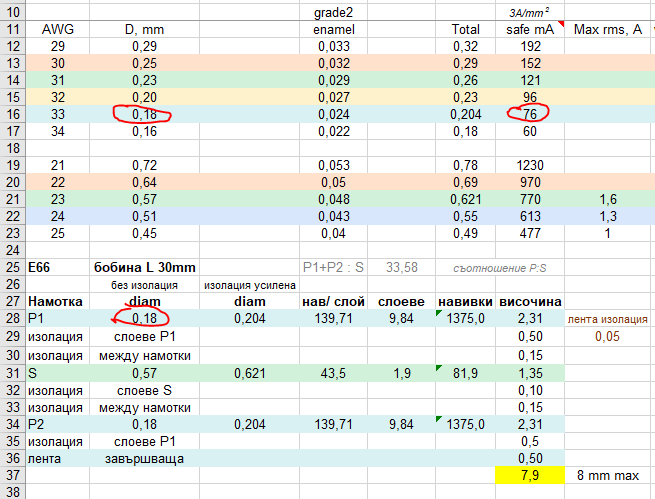 2. Почти се навиха да ми навият траф, ама не знам спецификациите... Значи, първичната гони 3000 навивки, вторичната мога да я сметна. 3000 навивки, за да има достатъчно индуктивност и да не реже баса много. По-долу е сметнато 9к : 8ома. 9к траф, за да става и за ел84 и подобни, и за ецл/пцл86 (имам 2-3 шепи препържени, все някои ще стават) Секциониране 1 първична - вторична - 2 първична, което да намали паразитната индуктивност и да могат да обадят високи до 8-10к. (без значение, че няма да ми трябва вероятно) Бонус, няма да има тези фазови врътки и проблемите с NFB. Идва момента с диаметрите на проводниците, на стандартен ламел Е66 едвам се хваща, намалих намотките на 2750. Сечение магнитопровод към 24А Опитвам се да се консултирам с AI колко тр. да е минималното сечение на първичната, дава ми някакви стойности в милиампери (continuous use) и аз за всеки случай си гоня 100mA. Гледам диаметър на проводник, който го дават уж на толкова, и не може да се хване на бобината. А би трябвало да може... Значи, ако е мрежов траф 24VA, първичната ще е от проводник, издъжащ 100мА (не знам какъв диаметър трябва да е. (230v *100мА = 23VA) След като промених първоначалното задание (бяха общо 1500 първична, но после смятах индуктивността и почти са удвоени), трафаджиите не ми отговориха на последния мейл и дано не са ме отсвирили